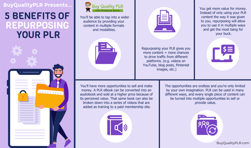 Not only that, but PLR products also make for fantastic content to populate your blog or website. You can repurpose the articles, videos, or graphics to engage your audience and establish yourself as an authority in your niche. And here’s the best part – you don’t have to be a digital marketing guru to do it. The hard work has already been done for you. All you need to do is add your personal touch and let the content work its magic.